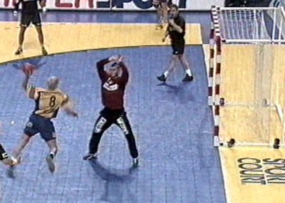 | Stefan Lövgren - Schwedens Kapitän. | Staffan Olsson erzwang die Verlängerung. | Henning Fritz - mit Irokesenfrisur. | Abwehrchef Klaus-Dieter Petersen mit Volker Zerbe (links). | |||