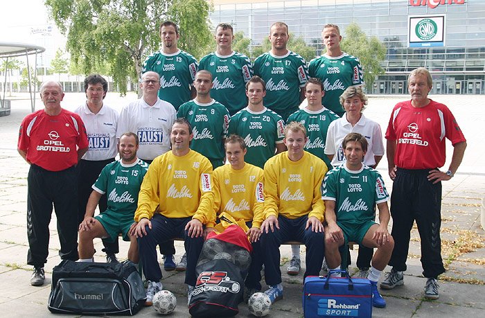 Hinten von links: Buschmann, Kusilew, Johannesson, Niemeyer; Mitte von links: Betreuer Müller, Mannschaftsarzt Dr. Pöhlmann, Mannschaftsarzt Dr. Sander, Vukas, J. Pohlmann, M. Pohlmann, Physiotherapeutin Wagner, Trainer Niemeyer;