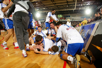 | Der Schütze des entscheidenen Tores zum 32:19, Gregory Anquetil, liegt am Boden und die Mitspieler stürzen sich jubelnd auf ihn. | Der Schütze des entscheidenen Tores zum 32:19, Gregory Anquetil, liegt am Boden und die Mitspieler stürzen sich jubelnd auf ihn. | Der Schütze des entscheidenen Tores zum 32:19, Gregory Anquetil, reißt jubelnd die Arme in die Höhe. | Der Schütze des entscheidenen Tores zum 32:19, Gregory Anquetil, liegt am Boden und die Mitspieler stürzen sich jubelnd auf ihn. | |||