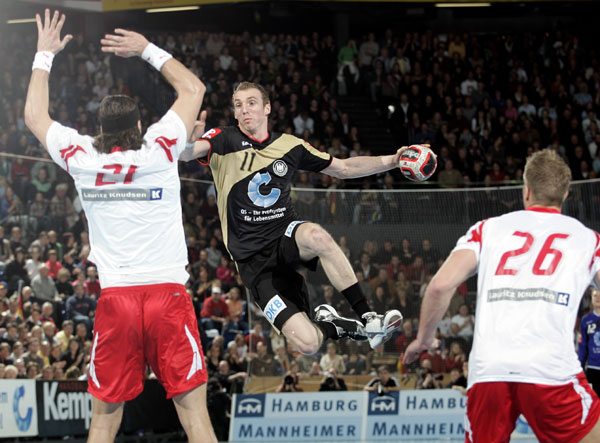 "Ich bekam schon beim Einlaufen meine erste Gänsehaut", meinte Dominik Klein, Linksaußen in Diensten des THW Kiel. "Die Stimmung war überragend." Und nicht nur das: Das Publikum war auch schlagfertig. Als Hallensprecher Rolf Körting zum wiederholten Male einen Treffer in der "Sparkassen-Arena zu Kiel" feierte, skandierten die Zuschauer im Chor "Ostseehalle". Der Name des Handballtempels hat sich seit dem 1. Januar geändert, das Feuer ist geblieben. Gegen eine deutsche Mannschaft, die wie aus einem Guss aufspielte, hatte der WM-Dritte keine Chance. Zumal Trainer Ulrik Wilbek seinen Spielmacher Joachim Boldsen schonte und der einzige Linkshänder im Rückraum, Kasper Söndergaard, wegen einer Magen-Darm-Grippe ausfiel.