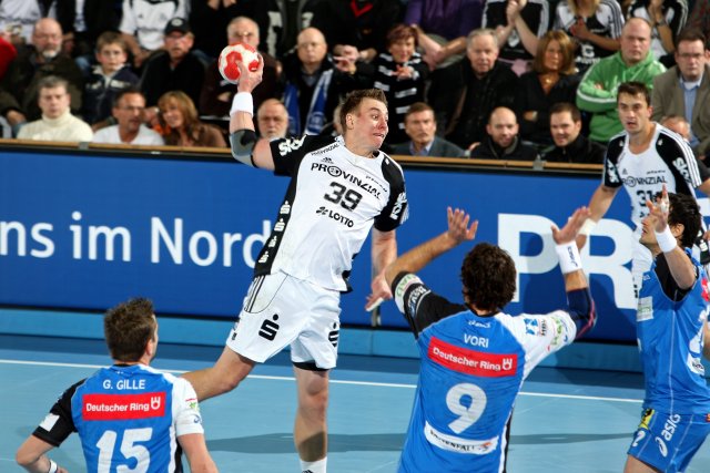 Bis zum 4:4 in der achten Minute ging es hin und her, Hens, Vori und Marcin Lijewski trafen für Hamburg, Ahlm und Jicha glichen mit ihren Doppelpacks aus. Dann fassten die Gäste Tritt, Kiels Tempospiel kam nicht in Fahrt, der Rückraum tat sich gegen die aggressive 3:2:1-Deckung schwer, die Außen wurden vernachlässigt. Außerdem fand der eigene Deckungsverband keine Bindung zu Torhüter Thierry Omeyer. Die Folge: 8:12 nach 20 Minuten. Hamburg wirkte abgeklärter, Jicha und Co. suchten nach der Tür zum Tor. 13:17 stand es nach 27 Minuten, als der Kieler Knoten platzte und Hamburgs Tormaschinerie Fehler produzierte. "Wühler" Marcus Ahlm, Christian Zeitz mit Einzelleistung und Momir Ilic mit Wucht: Der THW war zur Halbzeit wieder dran. 16:17.