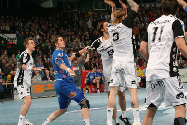 Während der wuchtige Kieler Rückraum um Ilic, Narcisse und Jicha jetzt vergeblich Lücken im TBV-Abwehrverband mit dem Mittelblock Kubes/Ilyes suchte und sich nur noch auf die Durchschlagskraft von Kim Andersson (9 Tore) verlassen durfte, zündeten die TBV-Spieler den Turbo. Ganz stark trumpfte vor allem der zuletzt in die Kritik geratene und zudem durch eine Oberschenkelverletzung gehandicapte Michael Kraus auf. Wie im Hinspiel avancierte der Nationalspieler zum besten Lemgoer Torschützen, traf insgesamt sieben Mal und führte sein Team bis zur Pause mit dem 14:14 ins Spiel zurück. Auffällig auch die Kieler Schwäche beim Überzahlspiel. Kubes und Co. langten in der Abwehr kräftig zu, landeten insgesamt siebenmal auf der Strafbank, aber die Tore erzielte der Gastgeber. Fünfmal trafen die Lemgoer in Unterzahl.