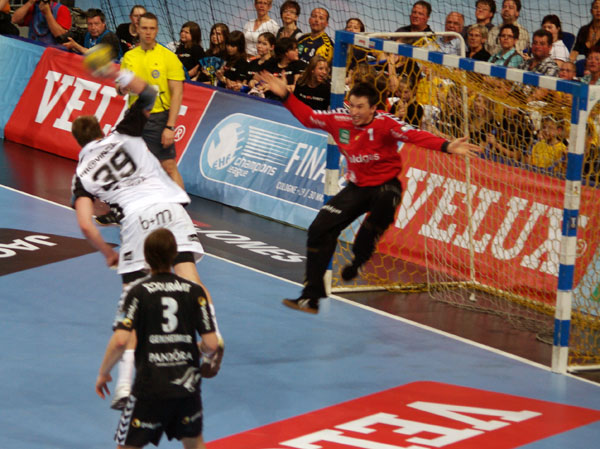 Nun begann die große Zeit des bereits zuvor gut aufgelegten Thierry Omeyer - drei Spielminuten, die Jungnationalspieler Patrick Groetzki so schnell nicht vergessen dürfte. Denn nach dem 8:10 durch Myrhol scheiterte der Rechtaußen zunächst mit einem Gegenstoß am Franzosen, nach einer Szmal-Parade gegen Zeitz kam Groetzki auch von außen nicht am Welthandballer vorbei und wusste eine weitere Minute später auch einen zweiten Gegenstoß nicht an Omeyer vorbei ins Tor zu bringen. Nachdem Sprenger nach schönem Narcisse-Anspiel das 11:8 erzielte, nahm Groetzki entnervt auf der Bank Platz. Olafur Stefansson rückte auf die Außenposition, Michael Müller in den rechten Rückraum. Und dieser führte sich gleich gut ein und traf zum 9:11. Mittlerweile war auch Bielecki aufs Parkett zurückgekehrt und sorgte mit zwei Treffern zum 11:12-Anschluss. Nachdem Szmal einen Ilic-Wurf entschärfte, hatten die Gastgeber die Chance zum Ausgleich, doch Omeyer hielt gegen den freigespielten Kreisläufer Klimowets und Jicha traf auf der Gegenseite. Michael Müller verkürzte zweimal, aber Sprenger mit einem sehenswerten Dreher und der von Narcisse glänzend eingesetzte Marcus Ahlm hielten den THW zur Halbzeit vorne. Beim Stand von 15:13 für die "Zebras" wurden somit die Seiten gewechselt.