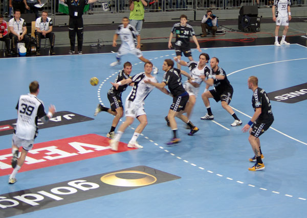 Wenig später gab es den ersten großen Aufreger der Partie: Der stark beginnende Christian Zeitz ließ sich von einem Fehlwurf nicht aus dem Konzept bringen und traf mit dem zweiten Versuch zur ersten Gästeführung. Dann rannte er schnellstens zur Bank, um sich gegen Abwehrspezialist Börge Lund auswechseln zu lassen, bekam von Uwe Gensheimer aber einen kleinen Schubser verpasst und blieb kurz außerhalb des Spielfelds liegen. Der Linksaußen der Mannheimer hatte Glück, dass die lettischen Schiedsrichter diese Aktion nicht mit einer Zeitstrafe ahndeten. Christian Zeitz hingegen traf nach einer Omeyer-Parade mit Wut im Bauch per Unterarmwurf auch zum 4:2, und nachdem Narcisse ein Bielecki-Anspiel abfing und Jicha per Gegenstoß auf 5:2 erhöhte, waren die Kieler bereits nach etwas mehr als fünf Minuten etwas enteilt.