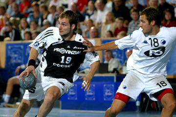 | THW-Neuzugang Viktor Szilagyi setzt sich gegen Kristian Svensson (rechts) in Szene. | Autogrammkarte 2005/2006: Viktor Szilagyi. | Saisoneröffnungspressekonferenz 2005: Die Neuzugänge. | Trainingslager 2005: THW-Trainer Noka Serdarusic (links) weist Neuzugang Viktor Szilagyi in das taktische Spiel ein. | |||