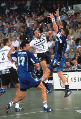 | Autogrammkarte 2001/2002. | Morten Bjerre. | Bjerre gegen Lozano, rechts Wislander am Kreis. | Morten Bjerre wird von der ABC-Deckung gestoppt. | |||