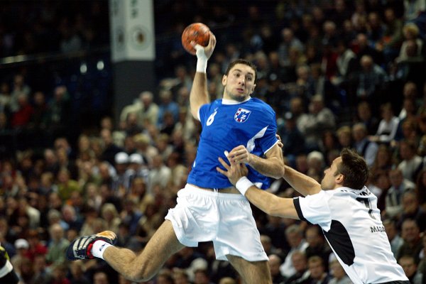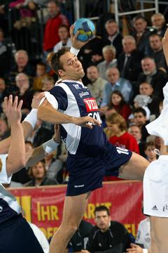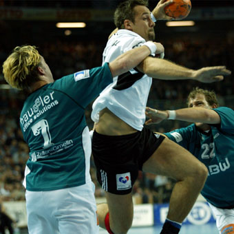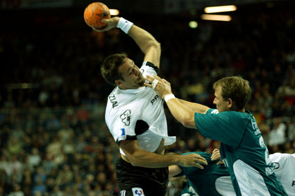 | Senianin Maglajlija setzt sich gegen Dominikovic und Bjerre durch. | Blazenko Lackovic gegen Bjerre. | Die THW-Deckung packt zu. | Morten Bjerre. | |||