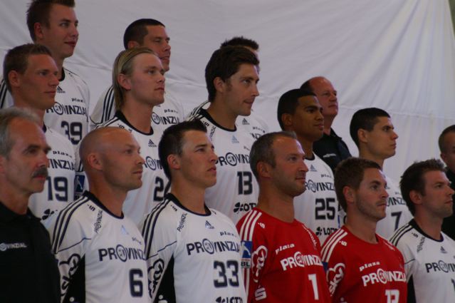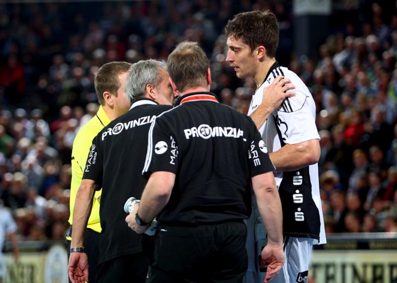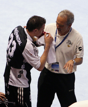 | Mannschaftsarzt Dr. Detlev Brandecker bei der Arbeit. Im Hintergrund ist Nikola Karabatic zu sehen. | Pittis Abschied: Die med. Abt. mit Dr. Brandecker, Brandenburg, Rother und Mommsen singt ein Ständchen. | Pittis Abschied: Die med. Abt. mit Dr. Brandecker, Brandenburg, Rother und Mommsen singt ein Ständchen. | Schrecksekunde: Die chronische Adduktorenzerrung macht sich bei "Löwe" wieder bemerkbar. | |||