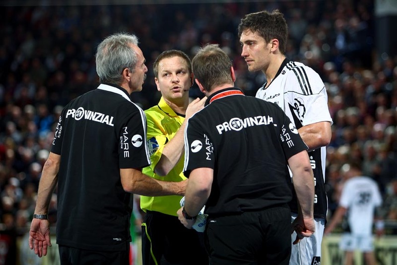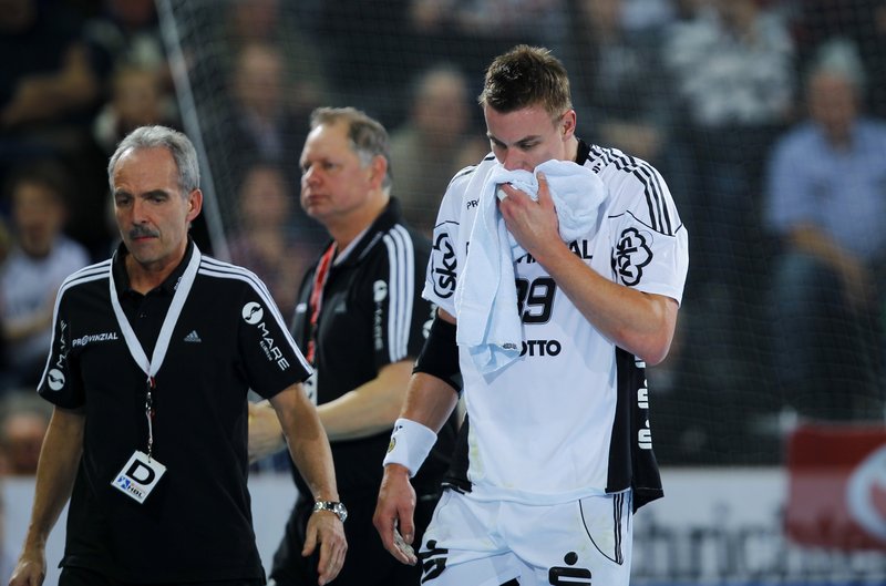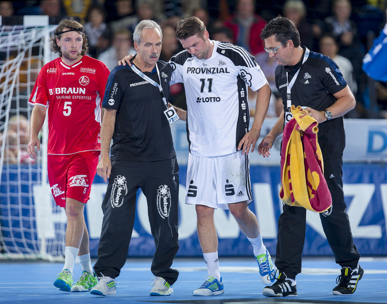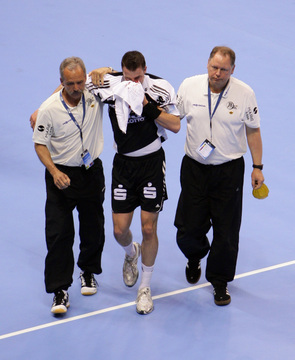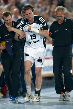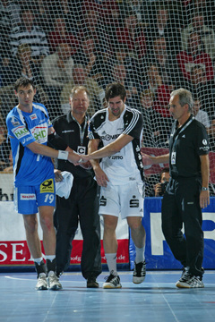 | THW-Spielmacher Viktor Szilagyi wird verletzt vom Platz geführt, links Physiotherapeut Dennis Missling und rechts Mannschaftsarzt Dr. Detlev Brandecker. | Viktor Szilagyi verlässt die Ostseehalle verletzt. | Adrian Wagner liegt verletzt am Boden, Physiotherapeut Uwe Brandenburg (mitte) und Mannschaftsarzt Dr. Detlev Brandecker (rechts) kümmern sich um den Linksaußen. | Schrecksekunde für den THW: Kapitän Stefan Lövgren wird von Physiotherapeut Uwe Brandenburg und Mannschaftsarzt Dr. Detlev Brandecker vom Platz geführt. | |||