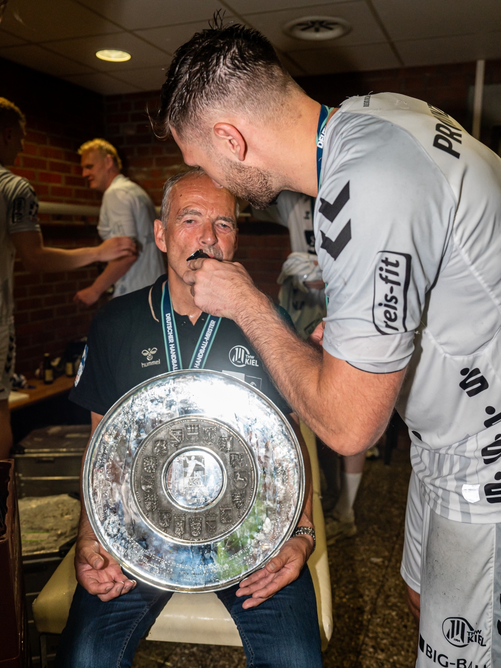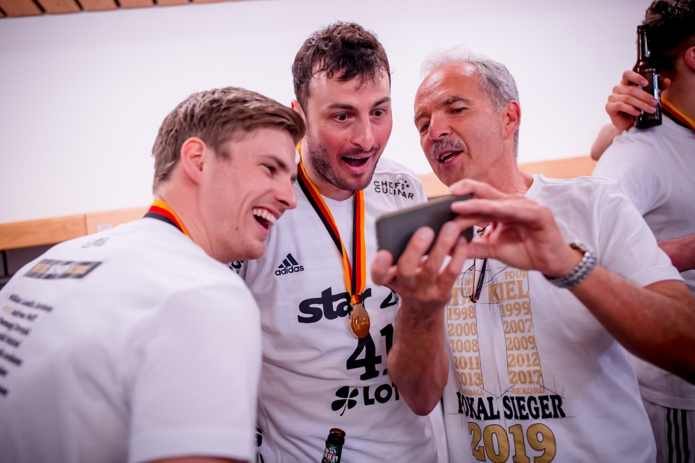 | Deutscher Meister! | THW-Mannschaftsarzt Dr. Detlev Brandecker bekommt von Harald Reinkind eine Rasur seines Schnauzbartes verpasst. | Porträt 2022/23 Dr. Detlev Brandecker. | Dr. Detlev Brandecker, Klaus-Dieter Petersen und Markus Engelmann. | |||