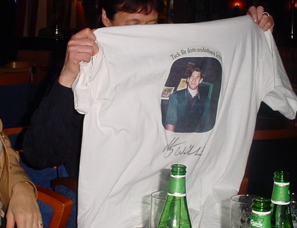 | Göteborg-Tour 2003: Das T-Shirt zur Tour: "Tack för dom underbara åren" - "Danke für die wunderbaren Jahre." | Göteborg-Tour 2003: Die Zebra-Flagge wird gehisst. | Göteborg-Tour 2003: Zebras an Bord! | Göteborg-Tour 2003: Die Halle in schwarz-weiß. | |||
