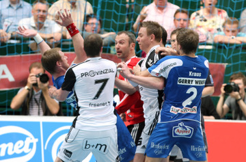| Alen Muratovic wird gestoppt. | Vid Kavticnik. | Jubel nach dem Sieg in Flensburg. | Vid Kavticnik. | |||