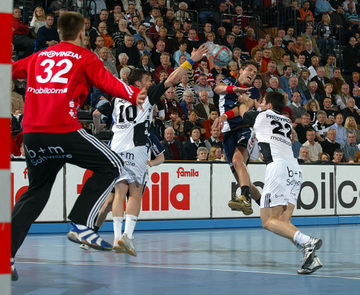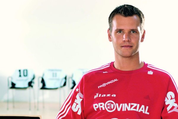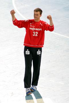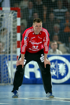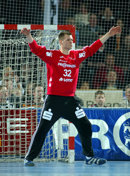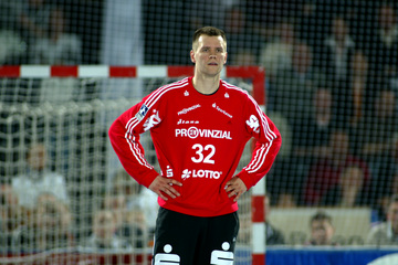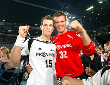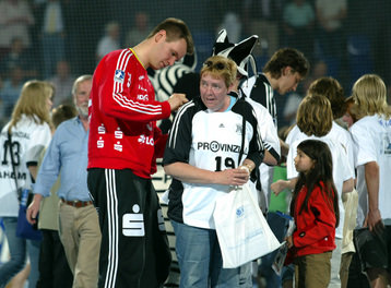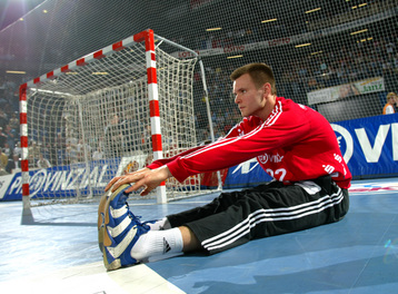 | Kiels dritter Torwart Dennis Klockmann dehnt sich während der Halbzeitpause. | Kiels dritter Torwart Dennis Klockmann dehnt sich während der Halbzeitpause. | Tipps vom Welthandballer des Jahres 2004: Henning Fritz nutzt die Halbzeitpause, um sich mit seinem Ersatz-Torwart Dennis Klockmann zu unterhalten. | Dennis Klockmann schreibt Autogramme. | |||