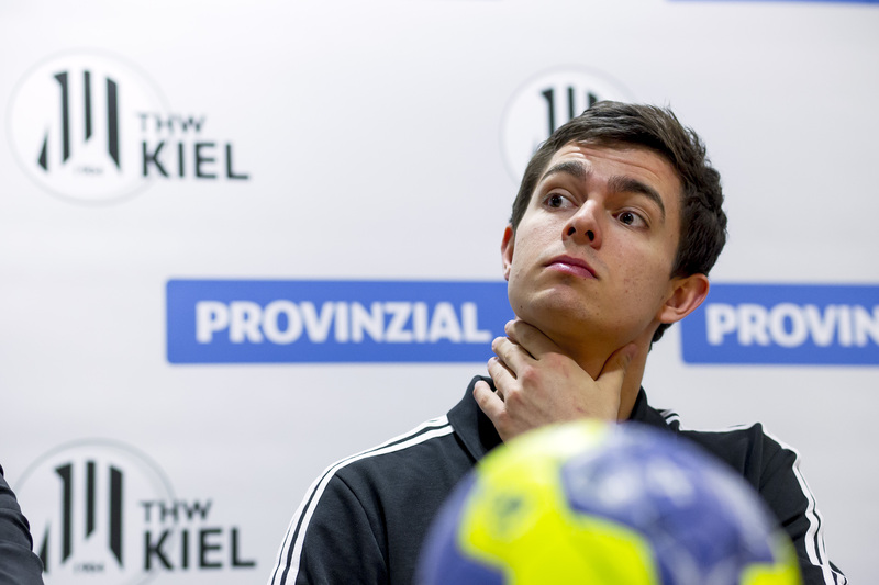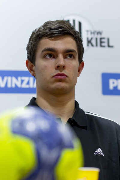 | Pressekonferenz zur Verpflichtung von Rasmus Lauge. | Spieleragent Christian Henriksen, Rasmus Lauge und Klaus Elwardt. | Klaus Elwardt, Rasmus Lauge und Alfred Gislason. | Rasmus Lauge. | |||