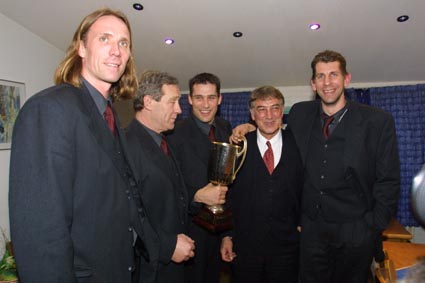 | EHF-Pokal-Finale 2002, Rückspiel: "Nur noch sechs Spiele. Ich bin ein bißchen traurig" | EHF-Pokal-Finale 2002, Rückspiel: Empfang am Vereinsheim - Wislander mit Provinzial-Vorstandsvorsitzendem Reime. | EHF-Pokal-Finale 2002, Rückspiel: Empfang am Vereinsheim. | Wislander, Roggisch, Petersen. | |||