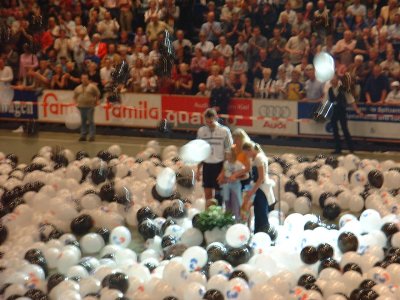 | Abschied von Max: Max im schwarz-weißen Ballon-Meer. | THW wird in Flensburg Meister: Abschied mit Tränen. | THW wird in Flensburg Meister: Max im Interview. | Meisterfeier 2002: Jubel um die Mannschaft. | |||