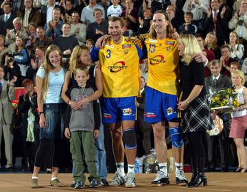 | Pittis Abschied: "Postbote" Magnus Wislander bringt "Pitti" als Geschenk die Meisterschale mit. | Pittis Abschied: "Postbote" Magnus Wislander bringt "Pitti" als Geschenk die Meisterschale mit. | Pittis Abschied: "Postbote" Magnus Wislander bringt "Pitti" als Geschenk die Meisterschale mit. | Staffan Olsson und Magnus Wislander wurden noch einmal offiziell verabschiedet. | |||