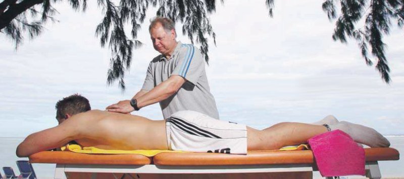 | Porträt 2017/18 Christian Zeitz. | Die Neuzugänge. | Uwe Brandenburg massiert Christian Zeitz auf La Reunion. | Spielszene. | |||