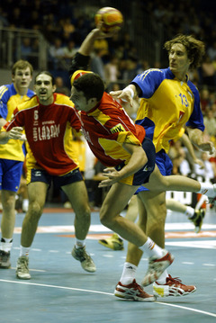 | Kreisläufer Marcus Ahlm setzt sich gegen Iker Romero durch und kommt frei zum Torwurf. | Marcus Ahlm beim Torwurf. | Marcus Ahlm ballt im Zurücklaufen die Faust. | Lars Christiansen am Ball, im Hintergrund Marcus Ahlm. | |||