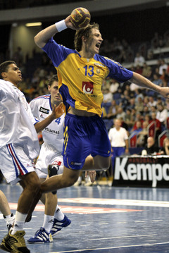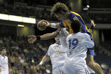 | Marcus Ahlm zieht ab. | Ahlm und Alvanos. | Marcus Ahlm setzt sich durch. | Nikola Karabatic setzt zum Sprungwurf an, Sigfus Sigurdsson und Steffen Stiebler stellen sich ihm entgegen. Ganz rechts Marcus Ahlm. | |||