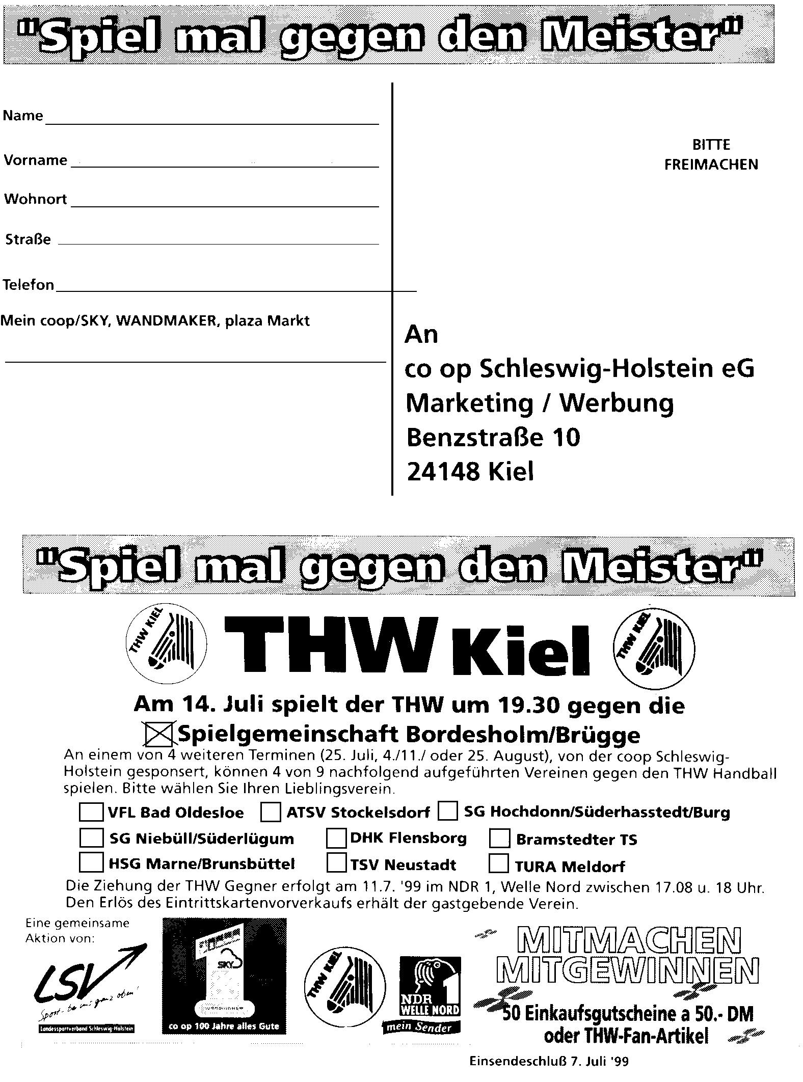 "Spiel mal gegen Meister".Am 14. Juli spielt der THW um 19.30 Uhr gegen die SG Bordesholm/Brügge. Für die weiteren vier Termine (25.7., 4.8., 11.8. und 25.8) können Sie aus den folgenden neun Teams vier Mannschaften auswählen, gegen die der THW antreten soll: