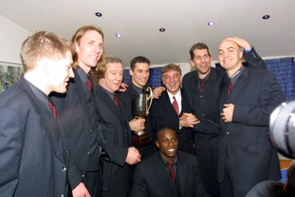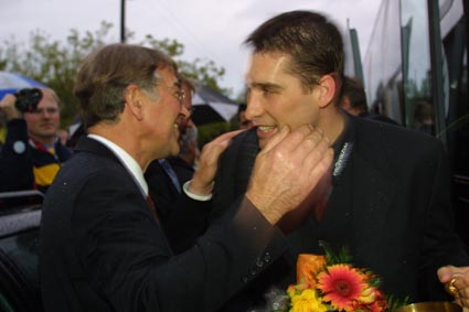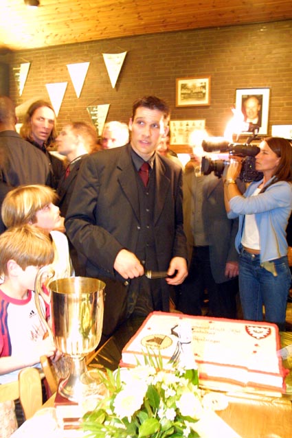 | EHF-Pokal-Finale 2002, Rückspiel: Empfang am Vereinsheim - Johan mit dem Pott. | EHF-Pokal-Finale 2002, Rückspiel: Empfang am Vereinsheim - Johan und Mattias mit dem Pott. | EHF-Pokal-Finale 2002, Rückspiel: Empfang am Vereinsheim. | ||||