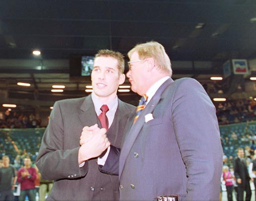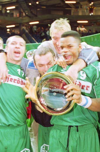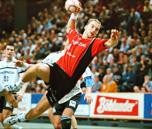 | Finale: Magdeburg - San Antonio: Sieger Magdeburg. | Finale: Magdeburg - San Antonio: Sieger Magdeburg. | EHF-Präsident Holmquist. | Roland Reime ehrt Stefan Lövgren als besten Spieler der Vereins-EM 2001. | |||