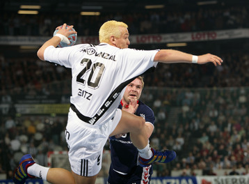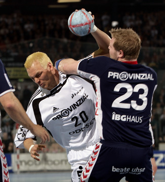 | Christian Zeitz wird von Joachim Boldsen attackiert. | Christian Zeitz setzt zum Torwurf an, im Hintergrund Joachim Boldsen. | Christian Zeitz im Gespräch mit Flensburgs Torwart Jan Holpert. | Flensburgs Trainer Kent-Harry Andersson und SG-Geschäftsführer Thorsten Storm sitzen nebeneinander auf der Bank. | |||
