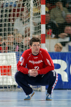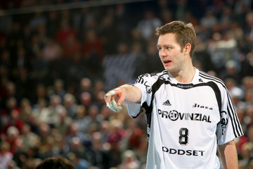 | Frode Hagen gibt Anweisungen. | Lars Christiansen am Ball, im Hintergrund Marcus Ahlm. | Frode Hagen hat die Finger seiner rechten Wurfhand stark getapet und hält damit einen Ball. | Hatten auch als Konkurrenten ihren Spaß: Kiels Frode Hagen und Flensburgs Joachim Boldsen. | |||