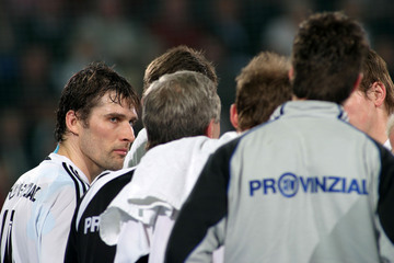 | SG-Geschäftsführer Thorsten Storm sitzt mit nachdenklicher Miene auf der Bank, während im Hintergrund Flensburgs Trainer Kent-Harry Andersson mit Andrej Klimovets spricht. | THW-Torwart Mattias Andersson kniet vor seinem Tor. | SG-Torwart Jan Holpert kniet vor seinem Tor. | Marcus Ahlm ballt im Zurücklaufen die Faust. | |||