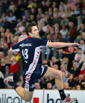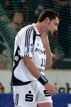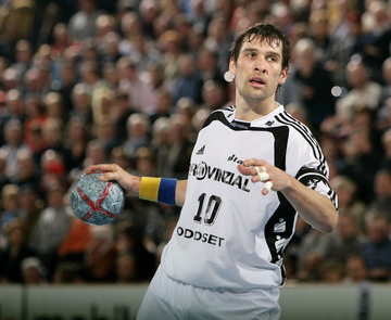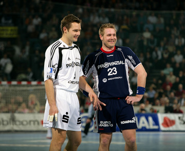| Kapitän Stefan Lövgren während einer Auszeit. | Adrian Wagner greift sich nach einem Foul an den Hals. | Norwegische Freunde: Glenn Solberg, Frode Hagen und Johnny Jensen. | SG-Kapitän Sören Stryger am Ball. | |||