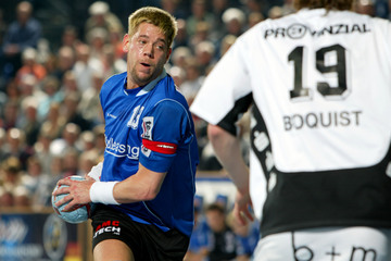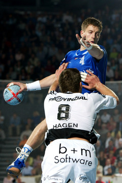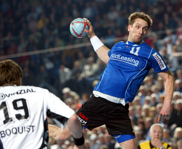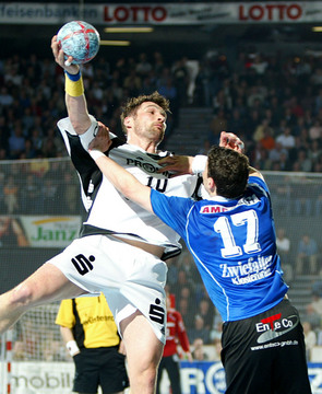 | Stefan Lövgren im Zweikampf mit Pfullingens Marco Bräuning. | ||||||
