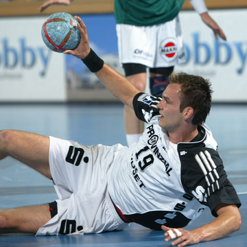 | Christian Zeitz fängt den Ball. | Stefan Lövgren setzt zum Sprungwurf an. In der Abwehr steht Lars-Henrik Walther. | Stefan Lövgren konzentriert sich auf den Ball. | Viktor Szilagyi liegt mit Ball in der Hand am Boden. | |||