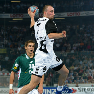 | Frode Hagen fasst konzentriert den Ball. | Frode Hagen beim Wurf. | Michael Kraus (links) im Gespräch mit seiem Mannschaftskollegen Christian Schöne. | Christian Zeitz. | |||