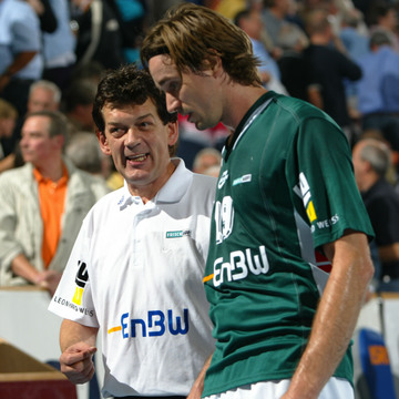 | Stefan Lövgren und Adrian Wagner verlassen nach dem THW Sieg das Spielfeld. | Die Schiedsrichterinnen Jutta Ehrmann und Susanne Künzig. | Mannschaftsarzt Dr. Detlev Brandecker bei der Arbeit. Im Hintergrund ist Nikola Karabatic zu sehen. | ||||