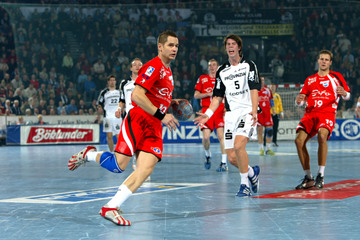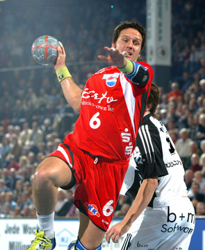 | THW-Torhüter Henning Fritz fachsimpelt während der Halbzeitpause mit seinem Kollegen Peter Gentzel von der HSG Nordhorn. | Nordhorns Holger Glandorf wird beim Wurf von THW-Mittelmann Viktor Syilagyi attackiert. | Iwan Usric beim Wurf aufs Tor. | Iwan Usric beim Wurf aufs Tor. | |||