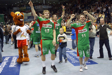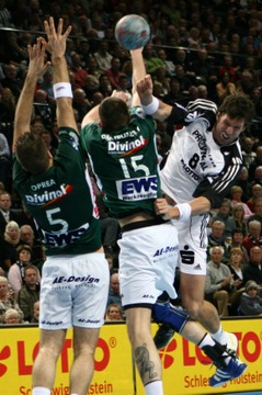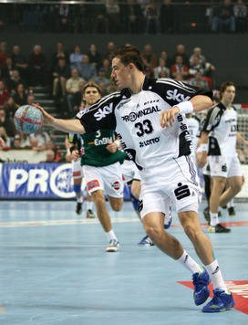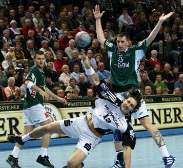 | Nikola Karabatic. | Marcus Ahlm verteidigt. | Pelle Linders ist durch. | Jubel beim SCM. | |||