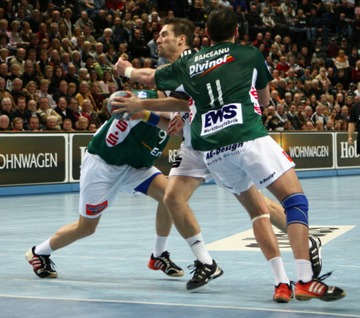 | Marcus Ahlm am Kreis. | Nikola Karabatic setzt sich durch. | Stefan Lövgren gegen Silviu Baiceanu. | Dominik Klein. | |||