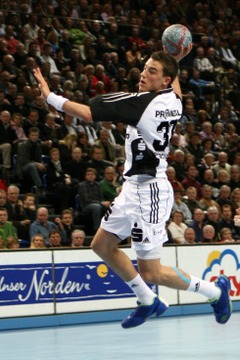 | Tobias Karlsson. | Tobias Karlsson. | Die leere THW-Bank. | Jeppesen verteidigt gegen Michel. | |||