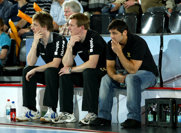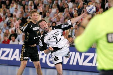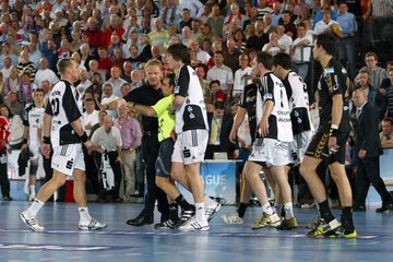 | Letzte Anweisungen von "Noka". | Uwe Schwenker blickt Richtung Champions-League-Pokal. | Die Bank der SG. | Der rot gesperrte Ljubomir Vranjes und sein Coach Kent-Harry Andersson. | |||