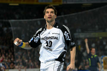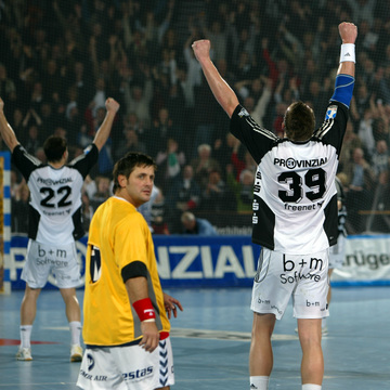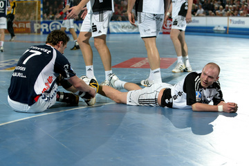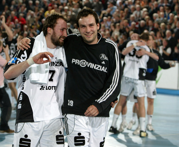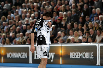 | Marcin Lijewski verlässtg nach seine dritten Zeitstrafe das Feld. | Marcus Ahlm. | Vid Kavticnik. | Kieler Jubel nach dem Sieg. | |||
