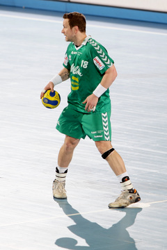 | Spielszene. | Henriksson am Kreis. | Gylfason gegen Omeyer. | Stefan Lövgren. | |||