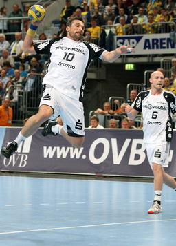 | Oliver Roggisch. | Nikola Karabatic setzt sich durch. | Die Fan-Clubs auf dem Weg nach Mannheim. | Filip Jicha. | |||