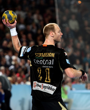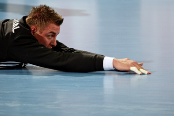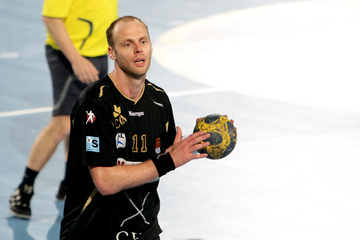 | Olafur Stefansson beim Strafwurf. | Arpad Sterbik. | Warmmachen. | Warmmachen. | |||