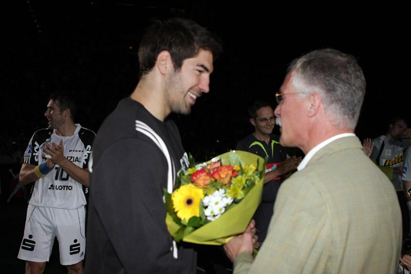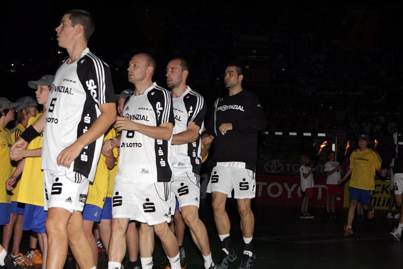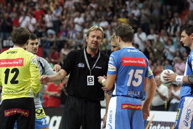 | Supercup 2008: Einlauf der Zebras. | Supercup 2008: Einlauf der Zebras. | Supercup 2008: Alfred Gislason. | Supercup 2008: HBL-Vorstand Rainer Witte beglückwünscht Thierry Omeyer zum Olympiasieg. | |||