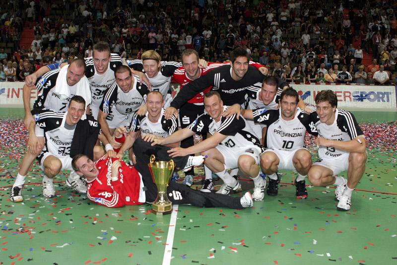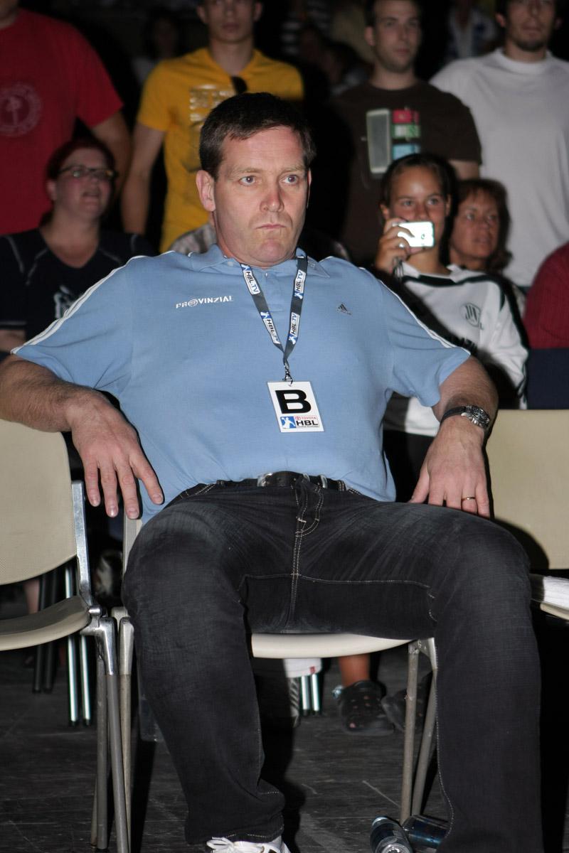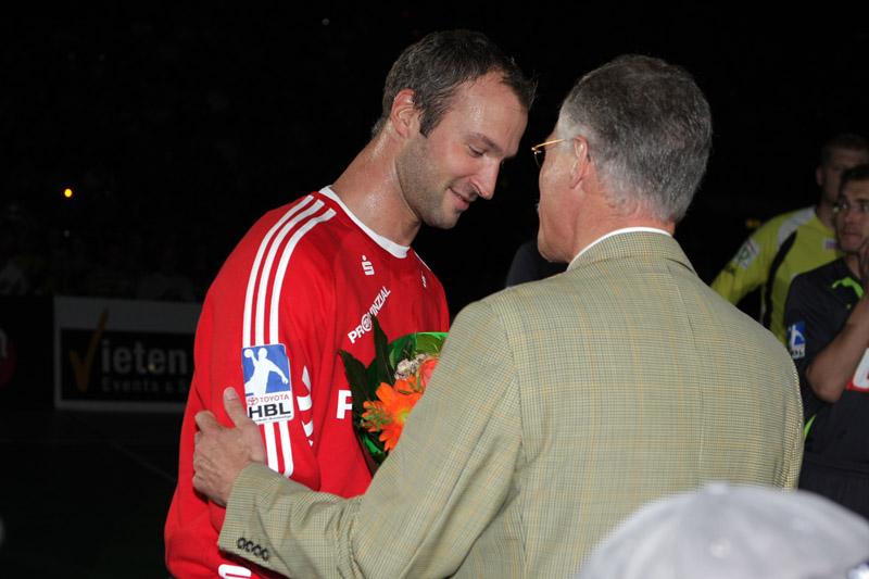 | Supercup 2008: HBL-Vorstand Rainer Witte beglückwünscht Nikola Karabatic zum Olympiasieg. | Supercup 2008: HSV-Trainer Martin Schwalb. | Supercup 2008: Vid Kavticnik. | Supercup 2008: Hendrik Lundström. | |||