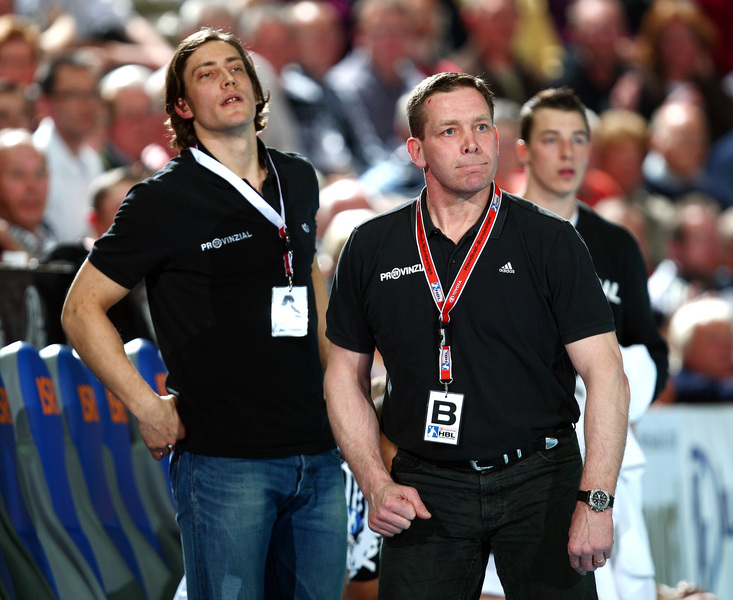 | Marcus Ahlm und Alfred Gislason. | Flensburgs Trainer Per Carlen. | Momir Ilic und Tobias Karlsson. | Filip Jicha und Tobias Karlsson. | |||