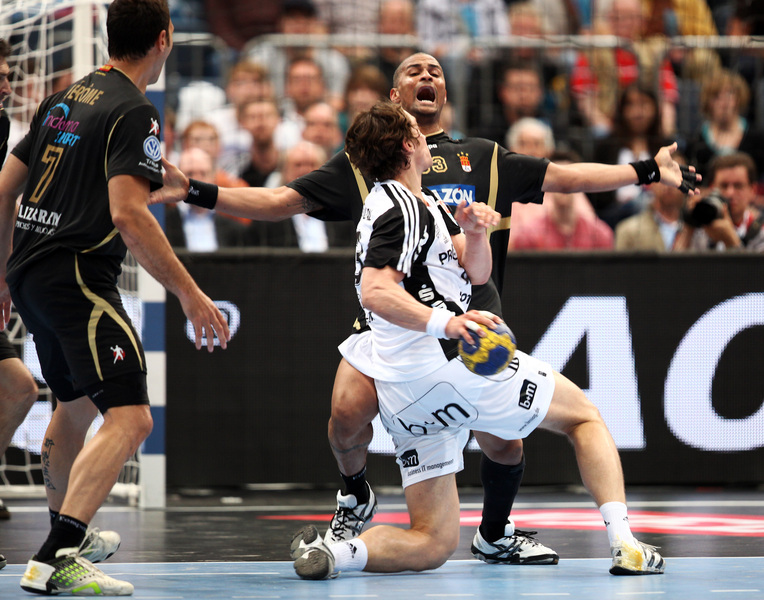 | Marcus Ahlm gegen Didiert Dinart. | Thierry Omeyer. | Ciudad Reals Trainer Talant Dujshebaev. | Die Lanxess arena in Köln. | |||