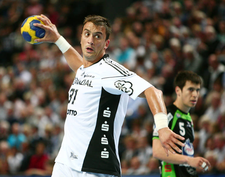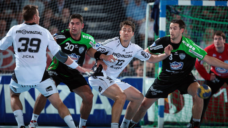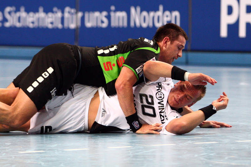 | Milutin Dragicevic gegen Holger Glandorf. | Spielszene. | Filip Jicha. | Aron Palmarsson. | |||