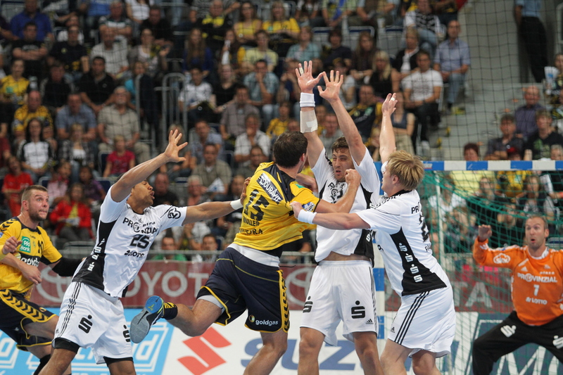 | Thierry Omeyer stürmt Richtung Löwen-Tor. | Daniel Narcisse. | Dominik Klein. | Börge Lund und Christian Zeitz. | |||